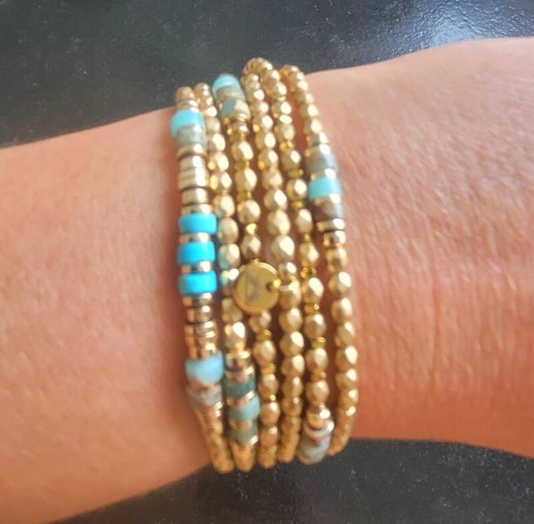 Il se compose de perles facettées de Bohème, d' intégrations en pierre semi-précieuses, Turquoise, Turquoise africaine,Jaspe et Heishi bronze.