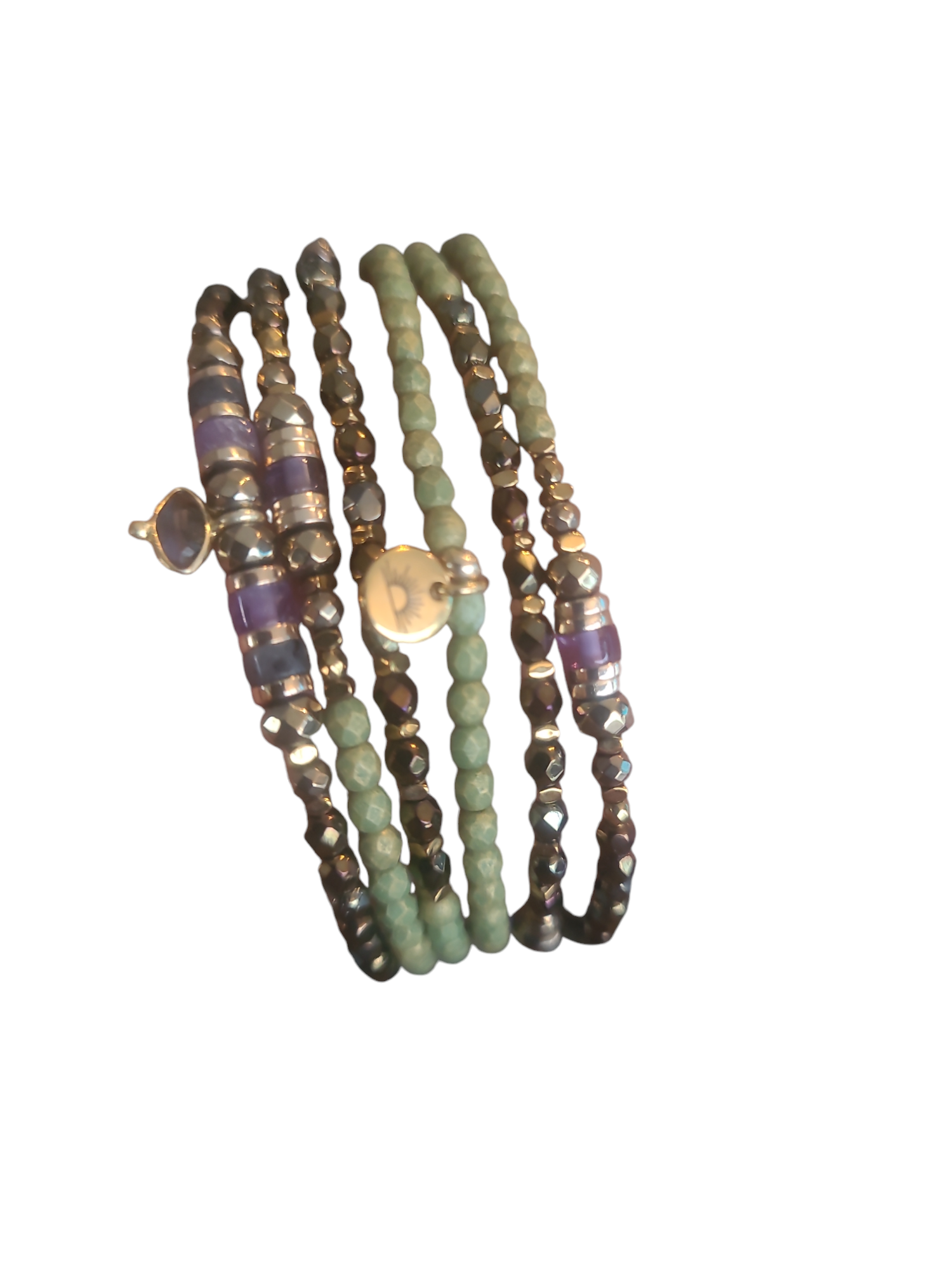 Il se compose de perles facettées de Bohème, d' intégrations de pierres semi-précieuses, Améthiste du Brésil, Larvikite et Hématite champagne.