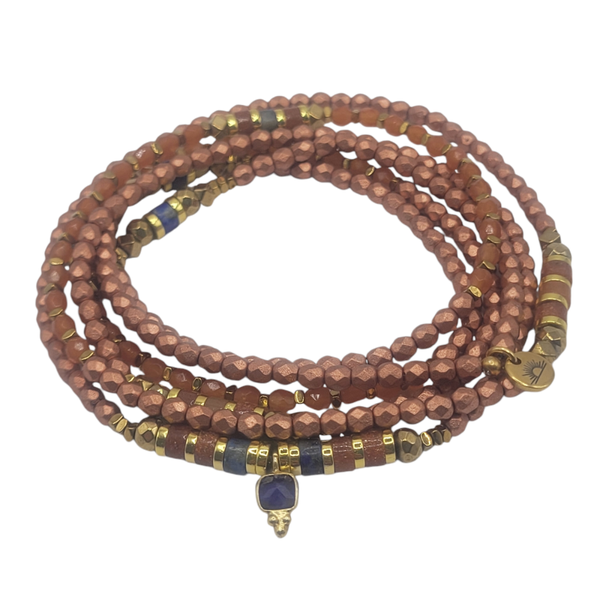 Il est composé de perles facettées de Bohème, d' intégrations de pierres fines, Lapiz lazuli, Gold sand, Agate jaune, Hématite dorée et Heishi.