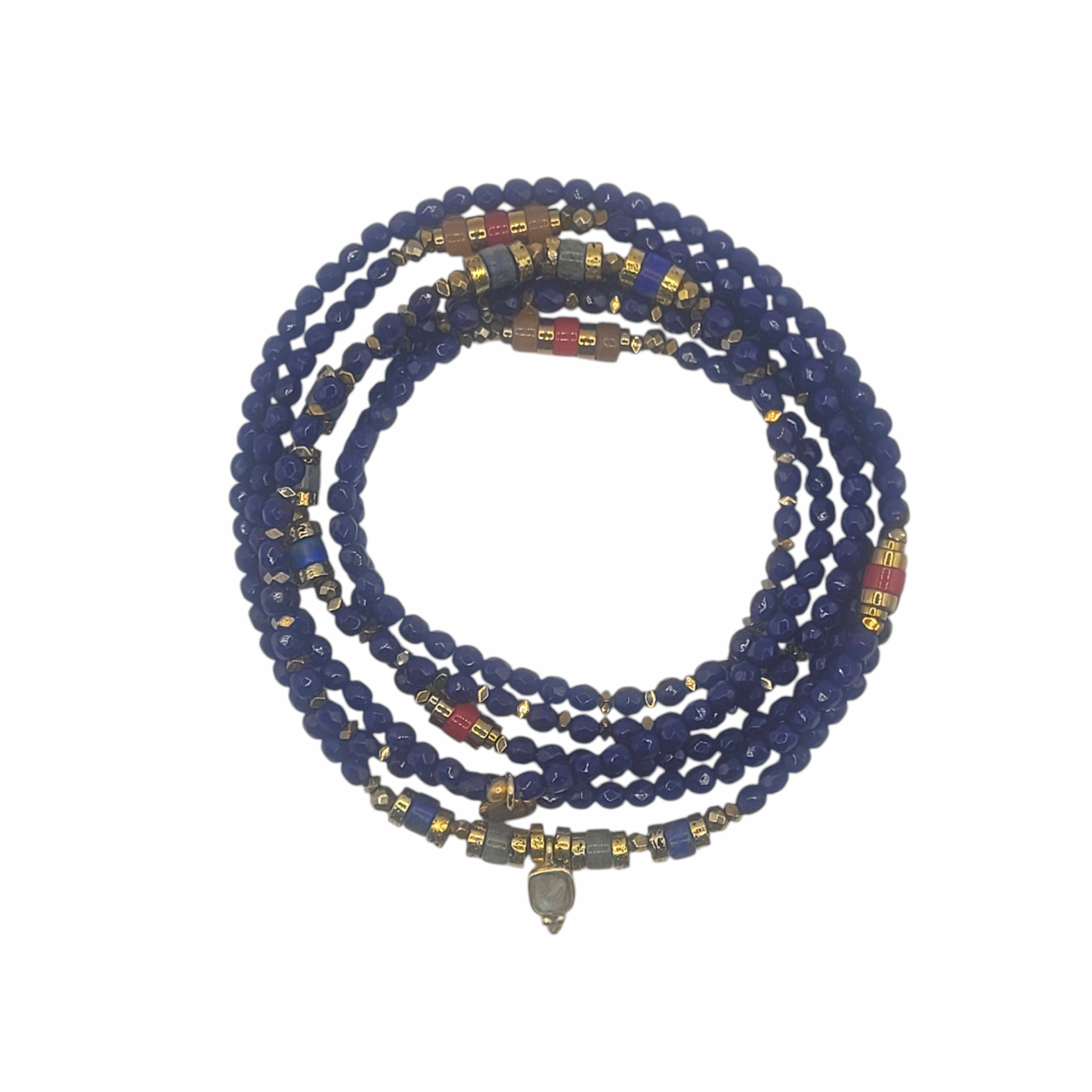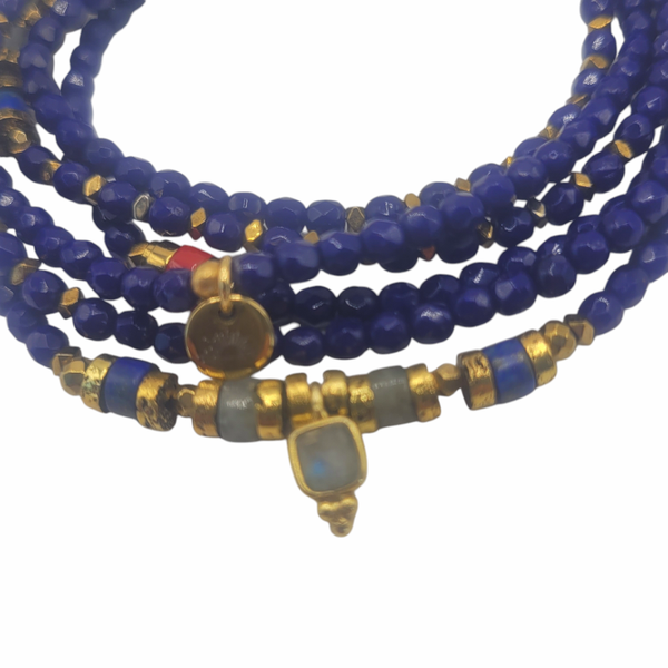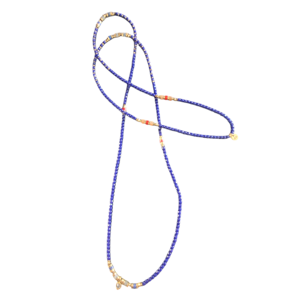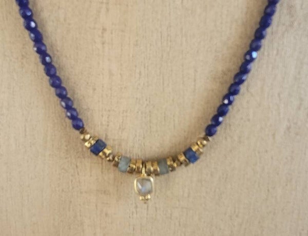 Il se compose de perles de Bohème facettées et d' intégrations de pierres fines, Agate jaune, Lapis lazuli, Labradorite, Corail rouge et Hématite.