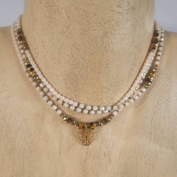 Ce bijou 2-en-1 peut se porter en sautoir, en collier multi-rangs ou en manchette 6 tours.