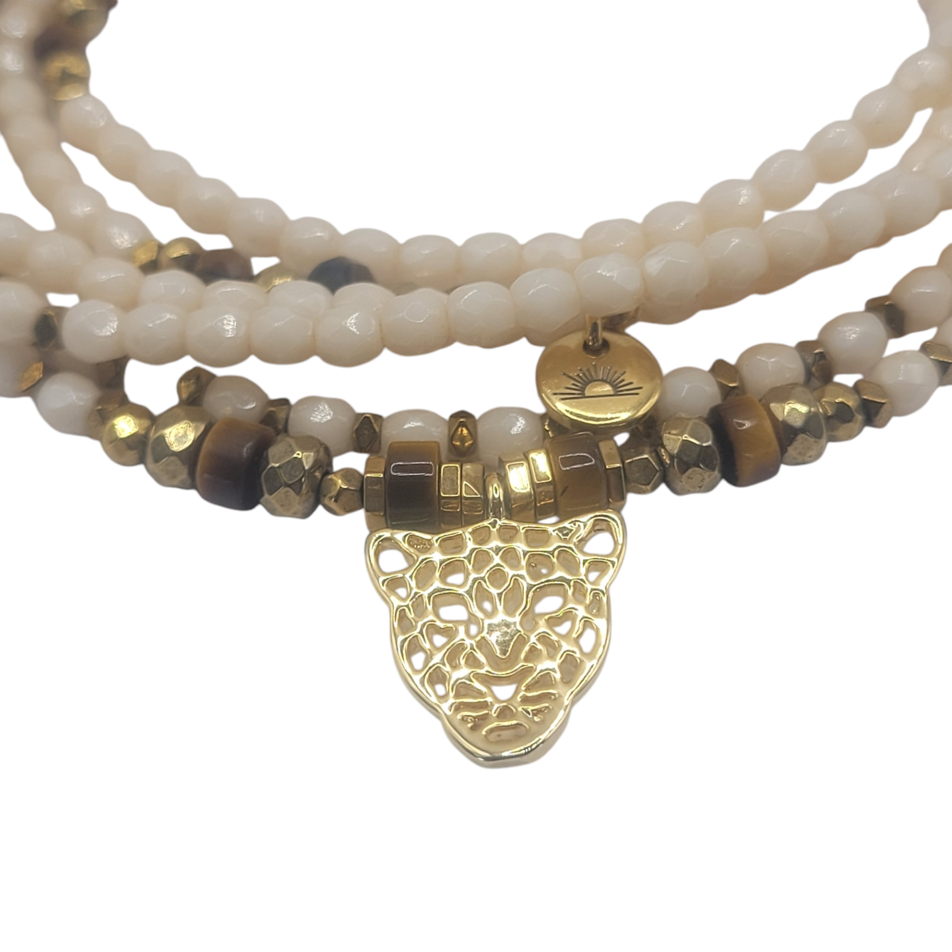 Il se compose de perles de Bohème facettées et d' intégrations de pierres fines, Oeil de Tigre et Hématite.