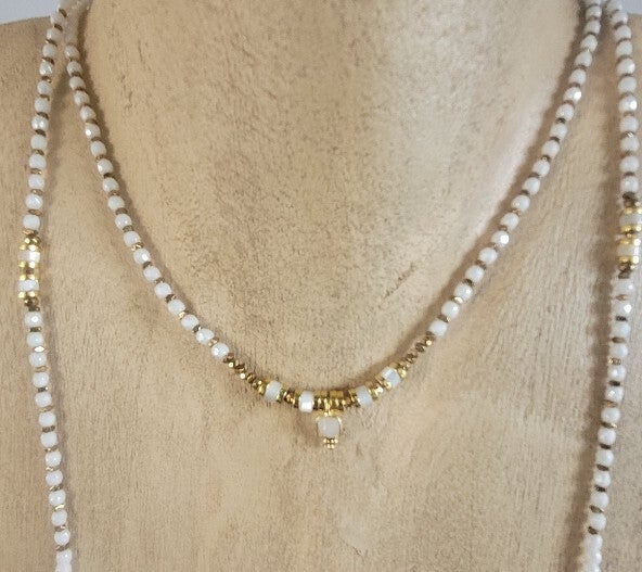 Il se compose de perles de Bohème facettées et d' intégrations de pierres fines, Nacre, Hématite et Heishi Nacre.