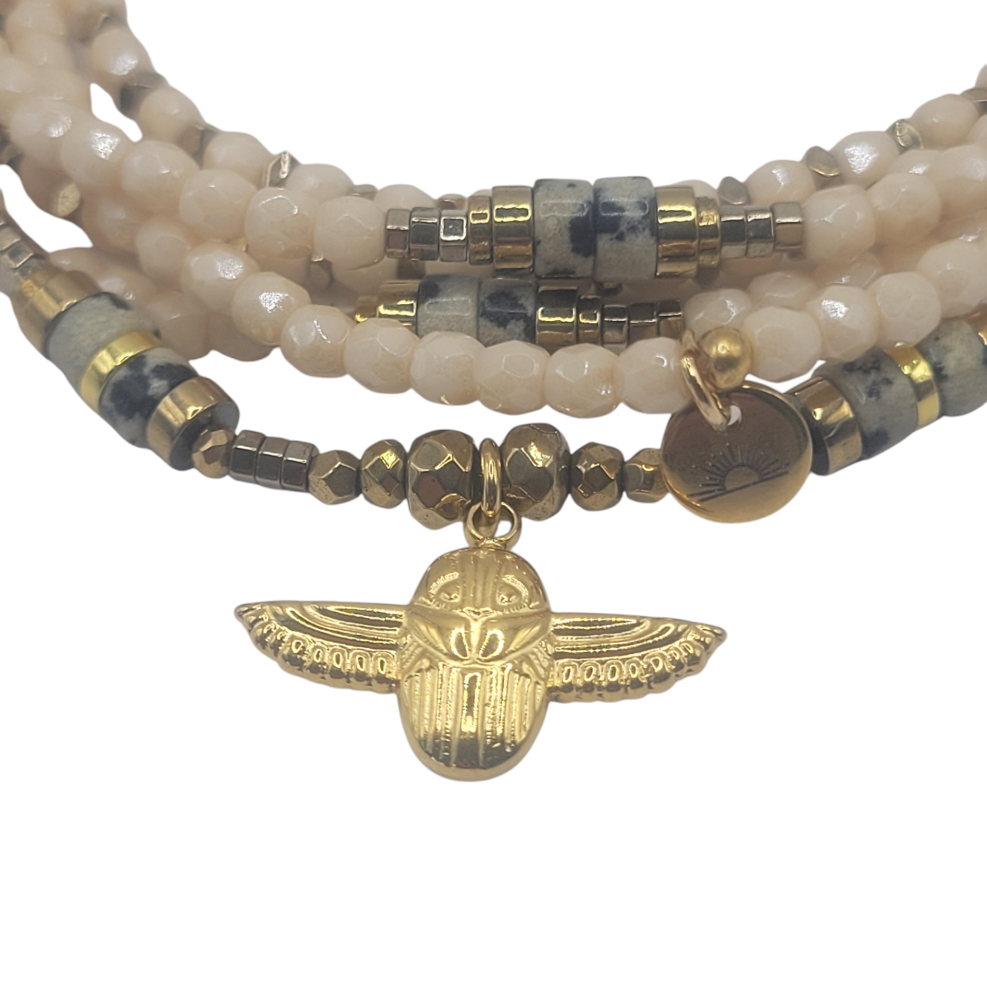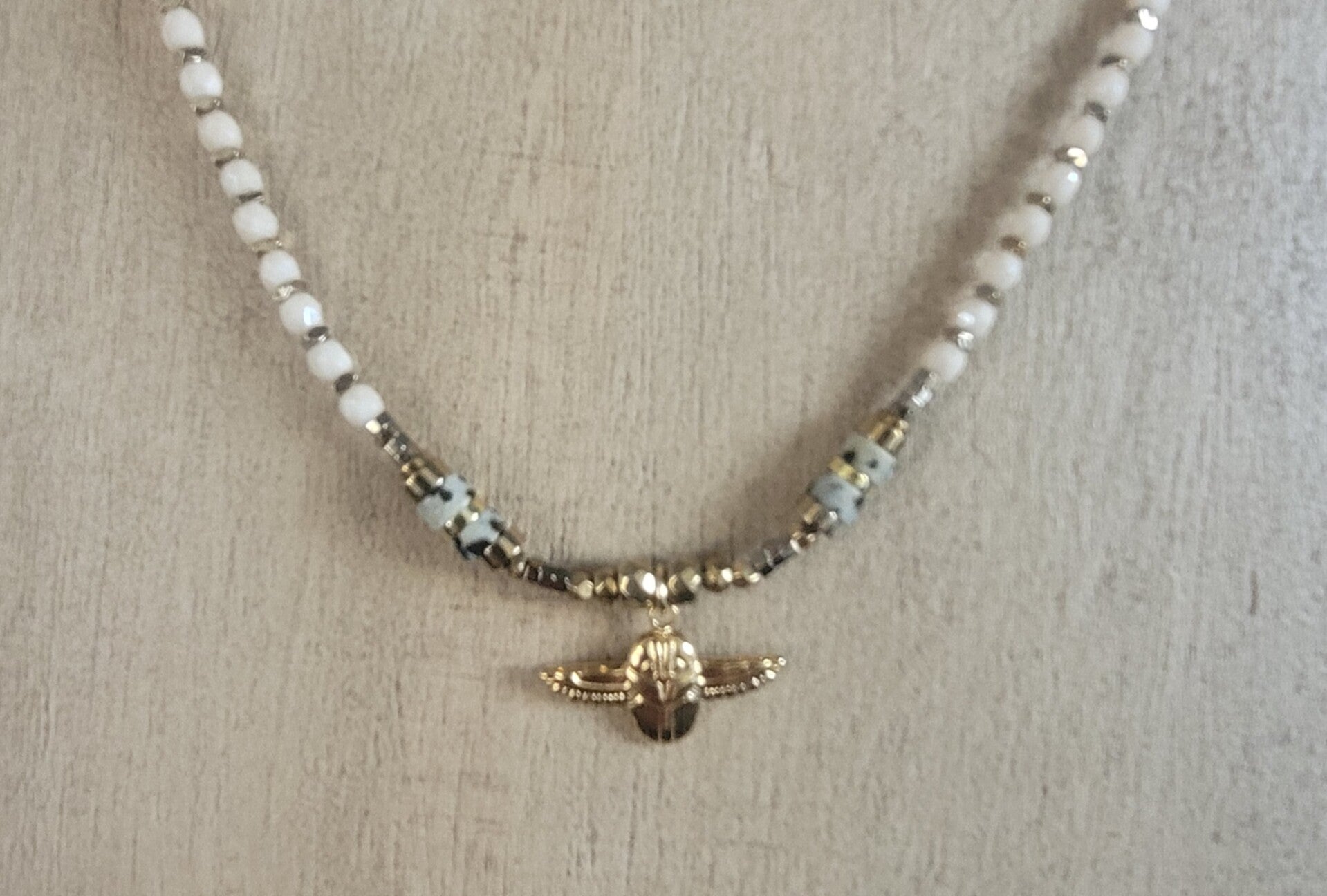 Il se compose de perles de Bohème facettées et d' intégrations de pierres fines, Jaspe dalmatien, Régalite et Hématite gold.
