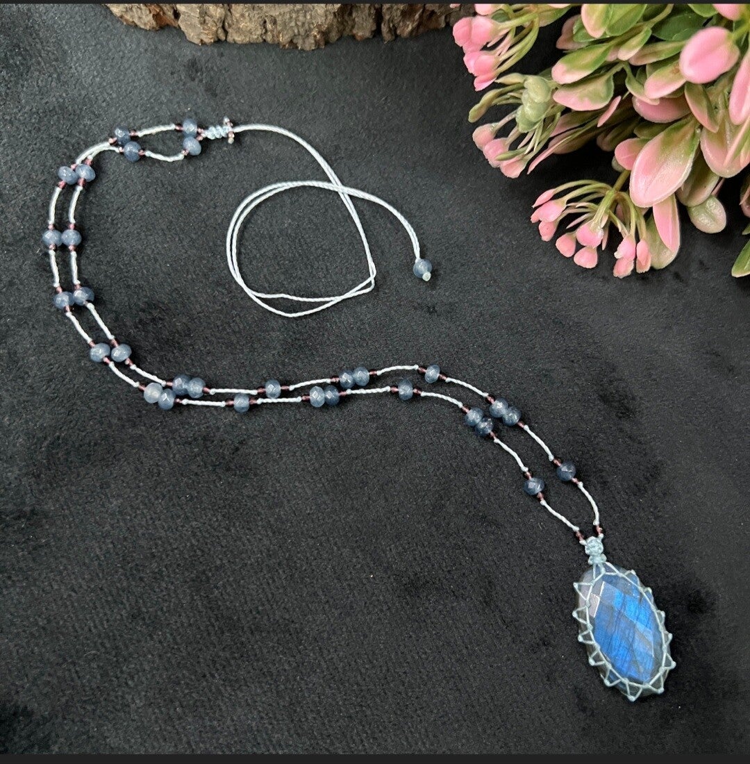 Pendentif en Labradorite, facetté et monté sur un lien résistant et associé à des perles fines facettées.