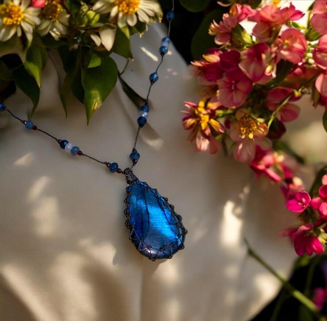 Pendentif en Labradorite monté sur un lien résistant et associé à des perles en pierre fine facettées.