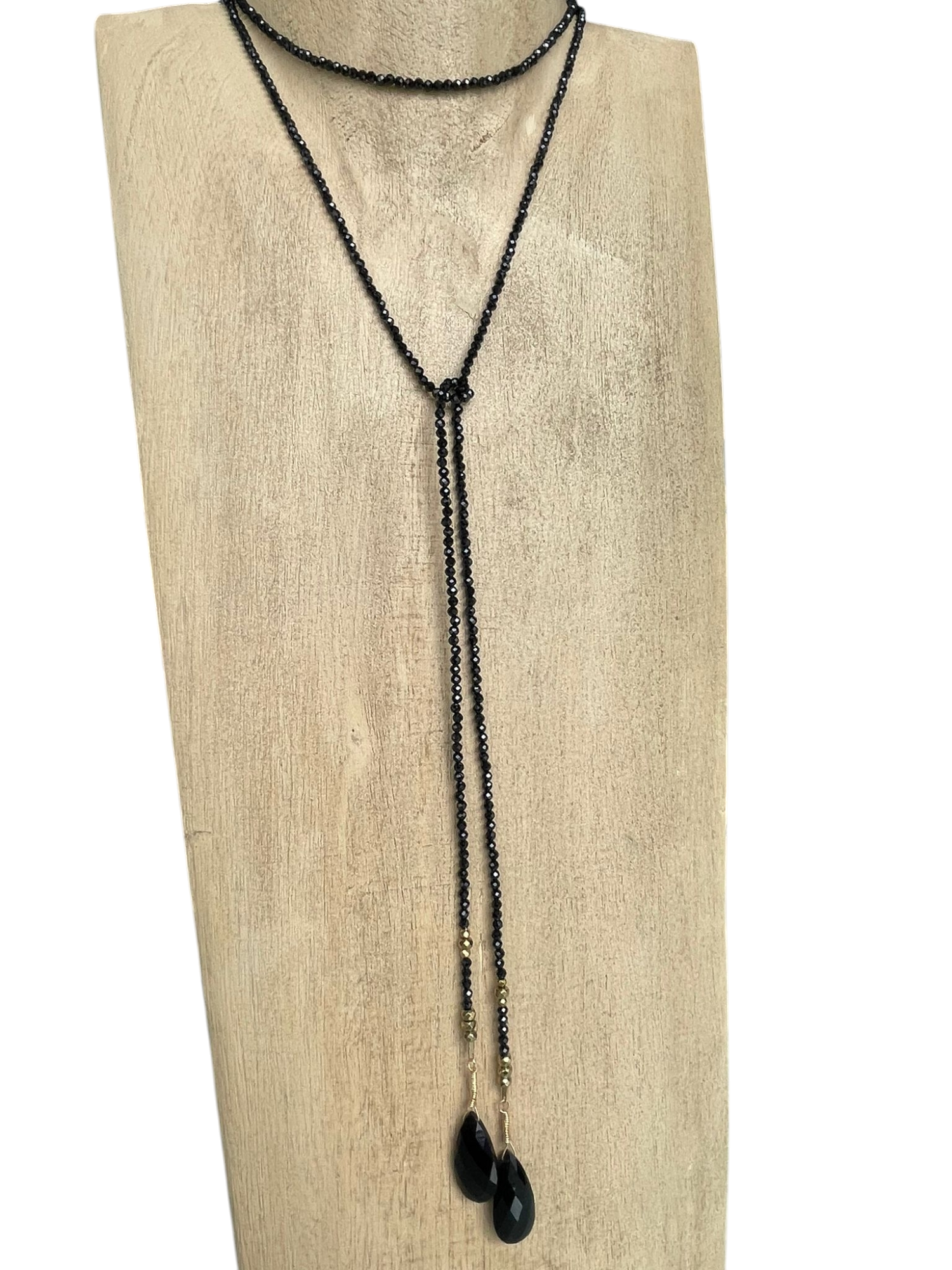 Deux gouttes facettées en Obsidienne terminent ce bijou.