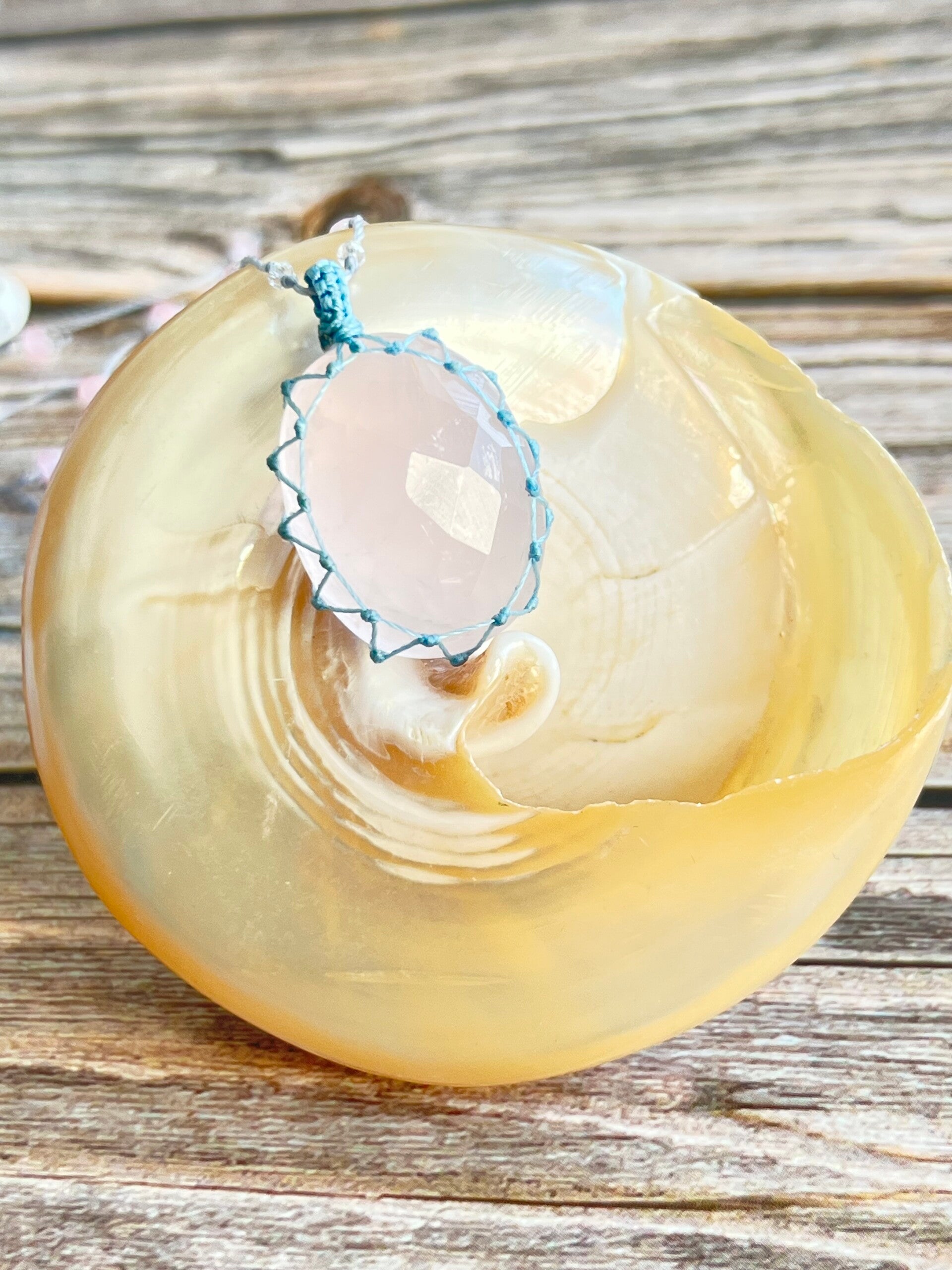 Pendentif ovale en Quartz rose facetté, monté sur un lien résistant et associé à des perles en pierres fines facettées.