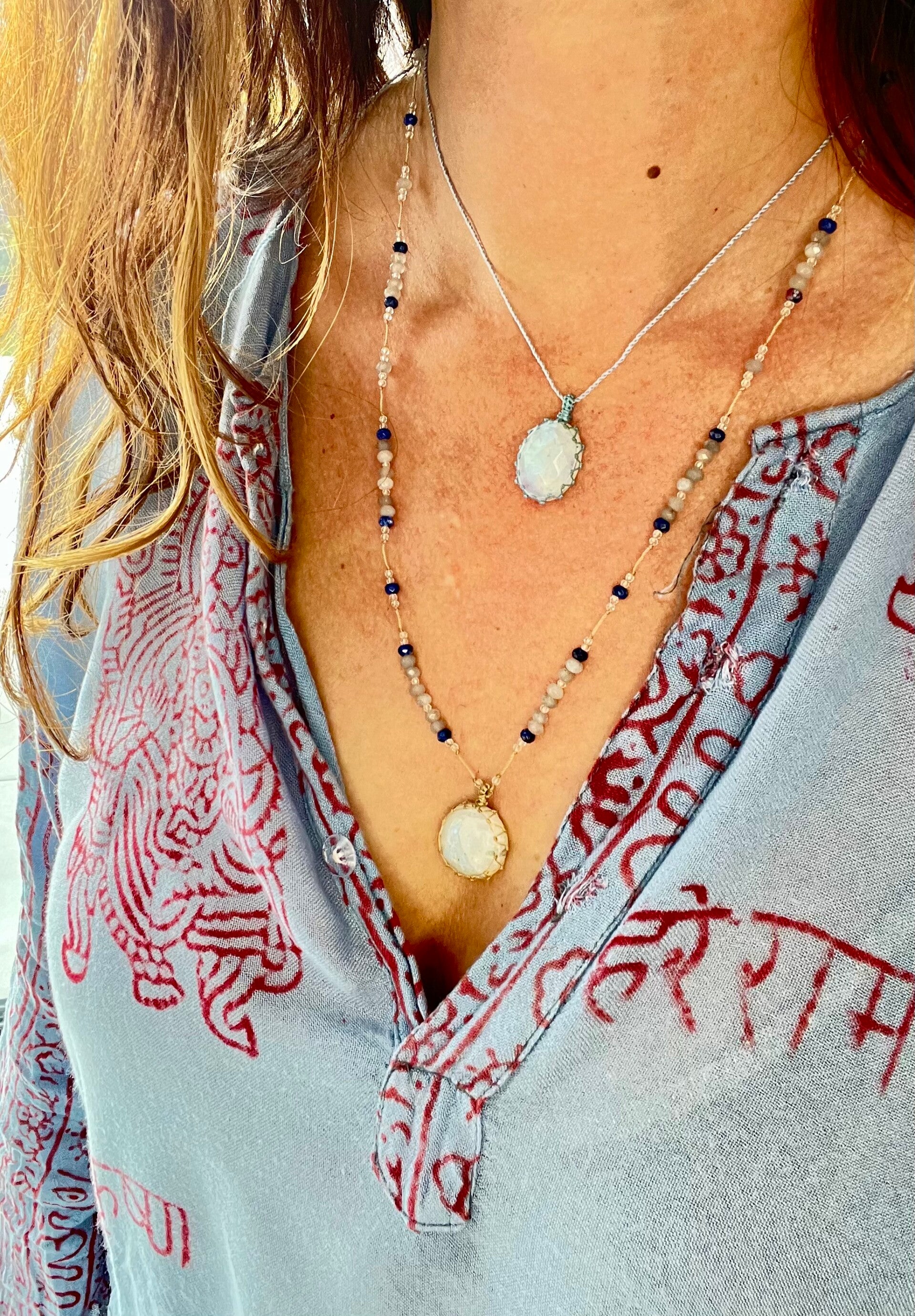 Pendentif ovale en Pierre de Lune facettée monté sur un lien résistant et associé à des perles en pierres fines facettées.
