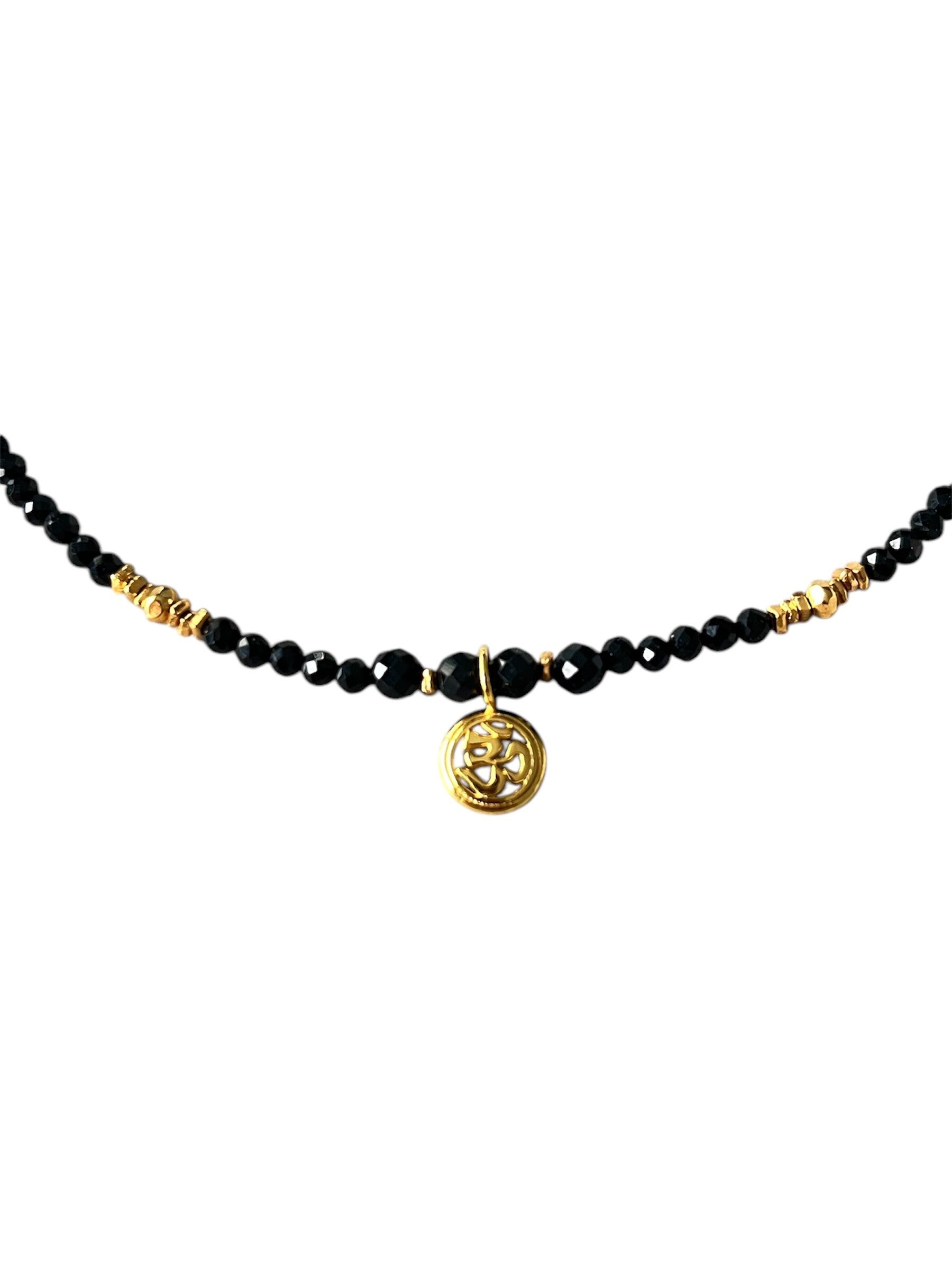 Ras de cou composé de perles facettées en Tourmaline noire (3 mm) et intégrations de petites perles dorées à l'or, 1 micron.
