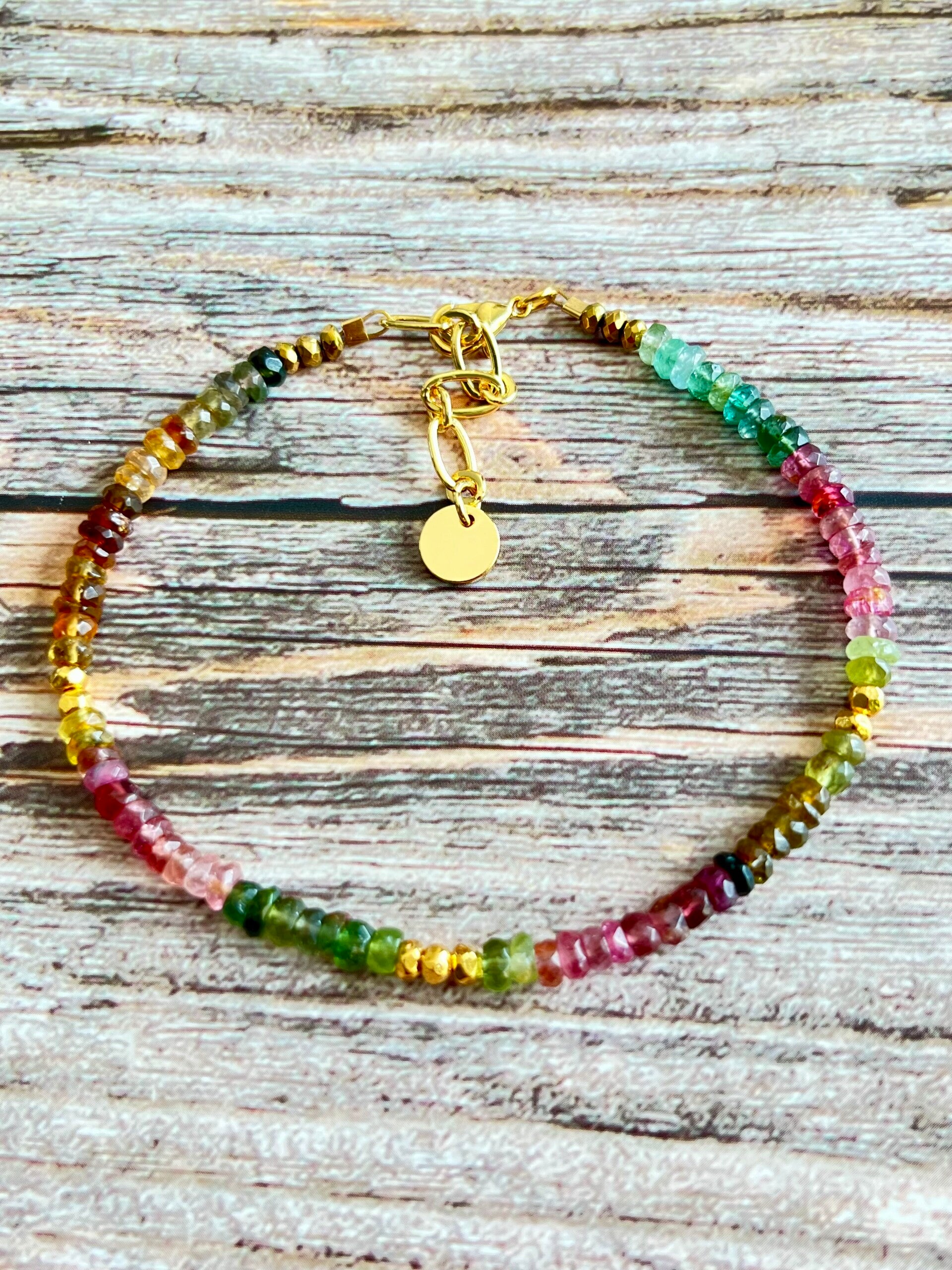 Bracelet composé de perles en Tourmaline rainbow facettées et perles dorées à l' or fin 24 carats, 1 micron.