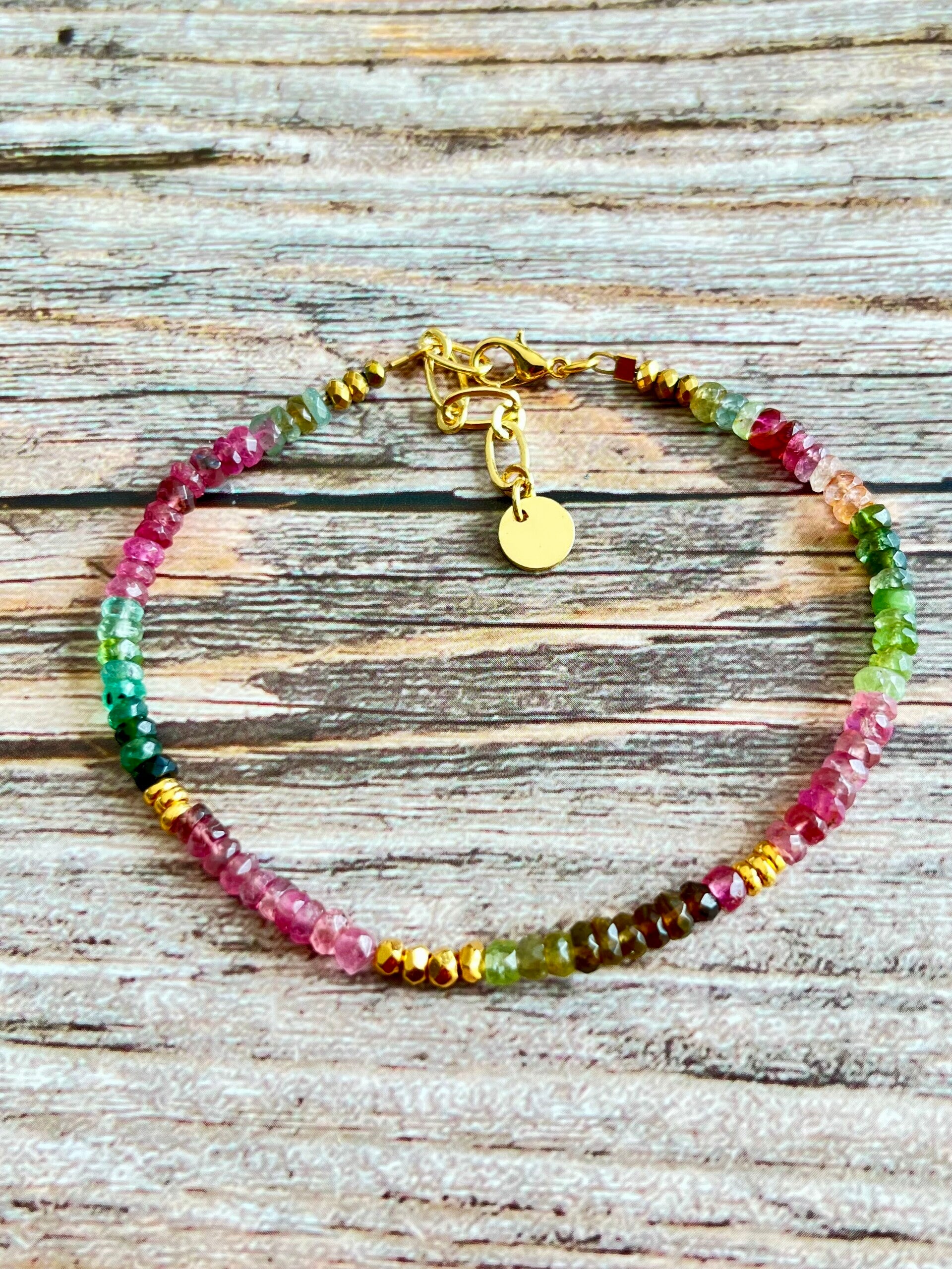 Bracelet composé de perles en Tourmaline rainbow facettées et perles dorées à l' or fin 24 carats, 1 micron.