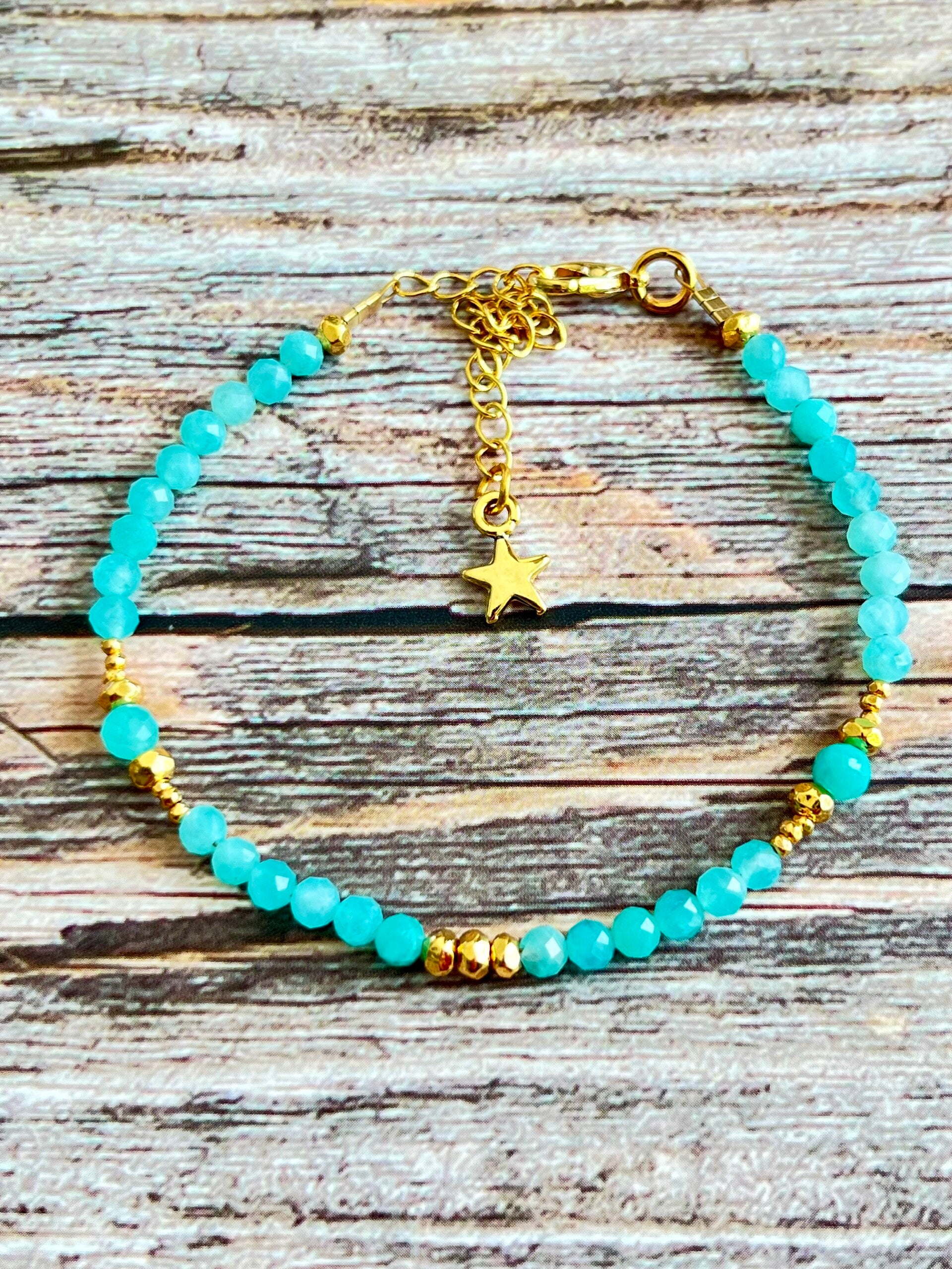 Bracelet précieux et minimaliste composé de perles facettées en Amazonite d' un bleu lagon et perles dorées à l' or 24 carats, 1 micron.