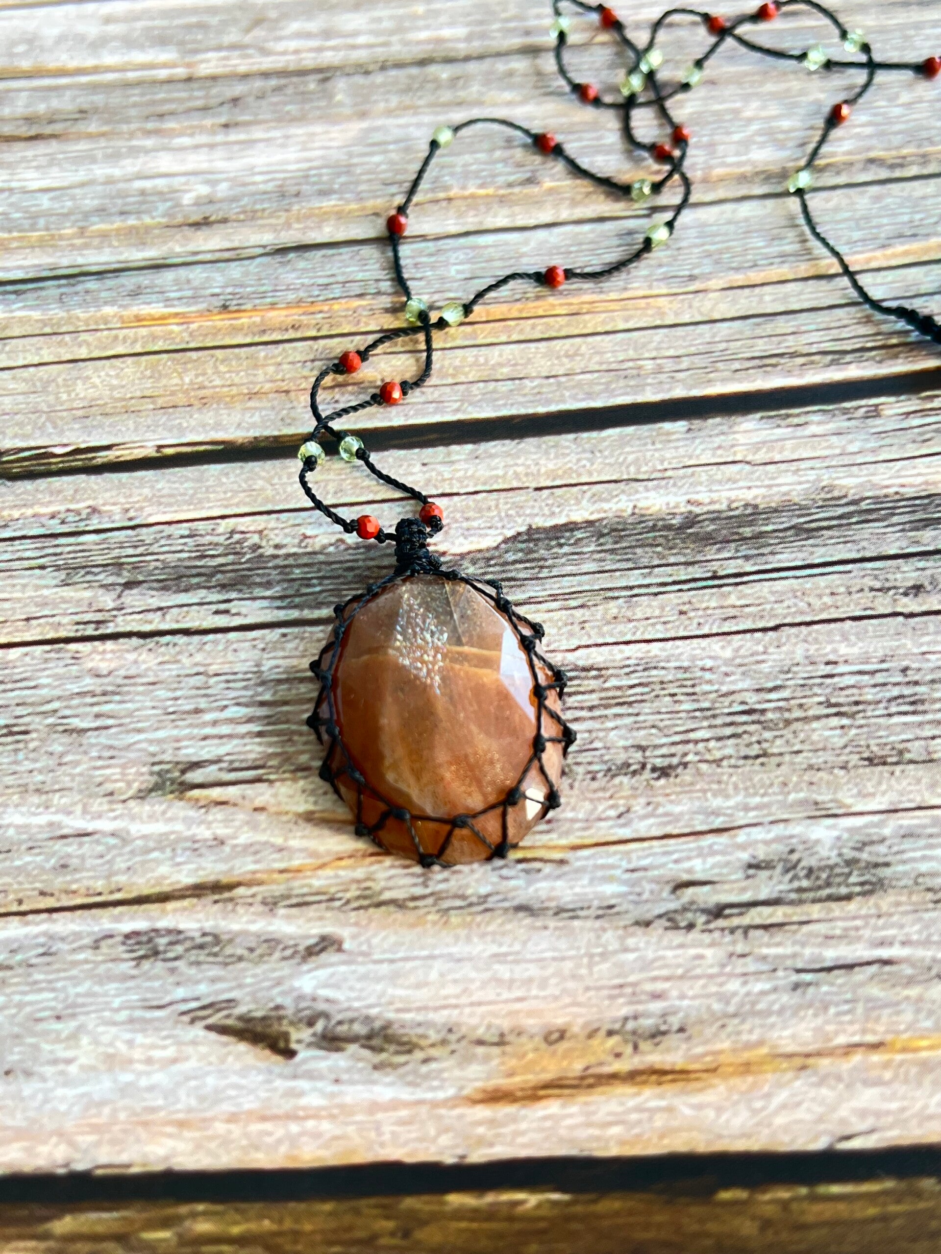 Pendentif en Pierre de soleil, facetté et monté sur un lien résistant et associé à des perles en pierres fines facettées.
