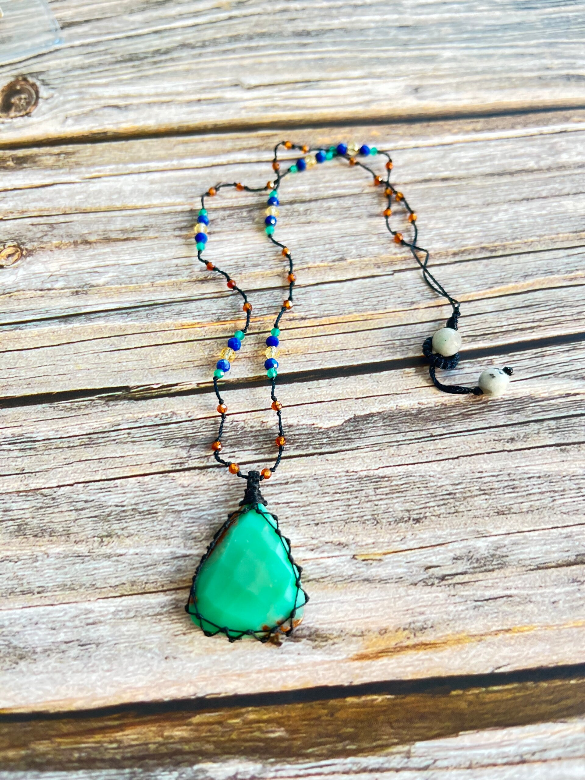 Pendentif en Chrysoprase, facetté et monté sur un lien résistant et associé à des perles en pierres fines facettées.