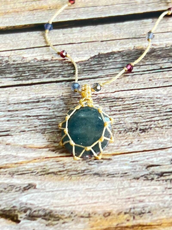 Pendentif en Saphir de Madagascar, facetté et monté sur un lien résistant et associé à des perles en pierres fines facettées.( 15x12mm).
