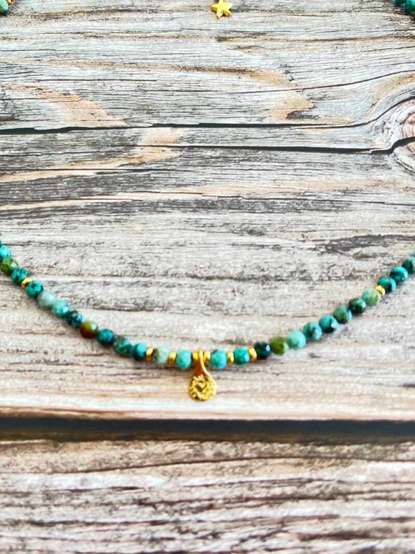 Ras de cou composé de perles en Turquoise africaine facettées et perles dorées à l' or fin 1 micron.
