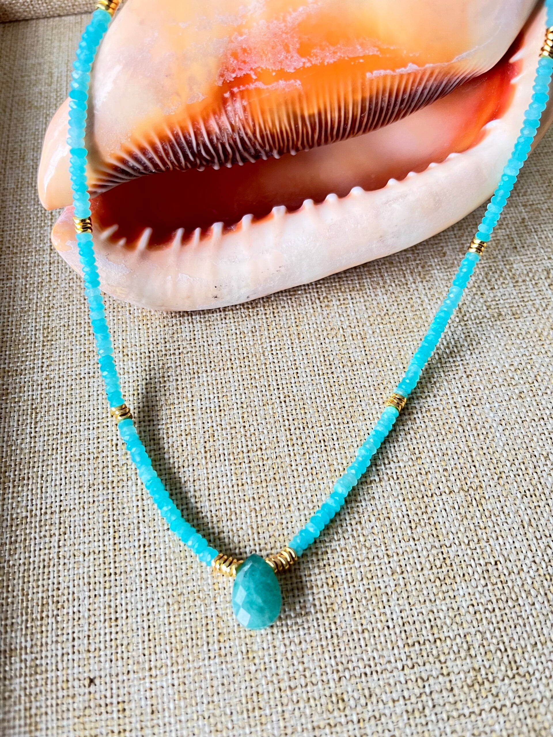 Collier composé de perles rondelles à facettes en Amazonite et Heishi.