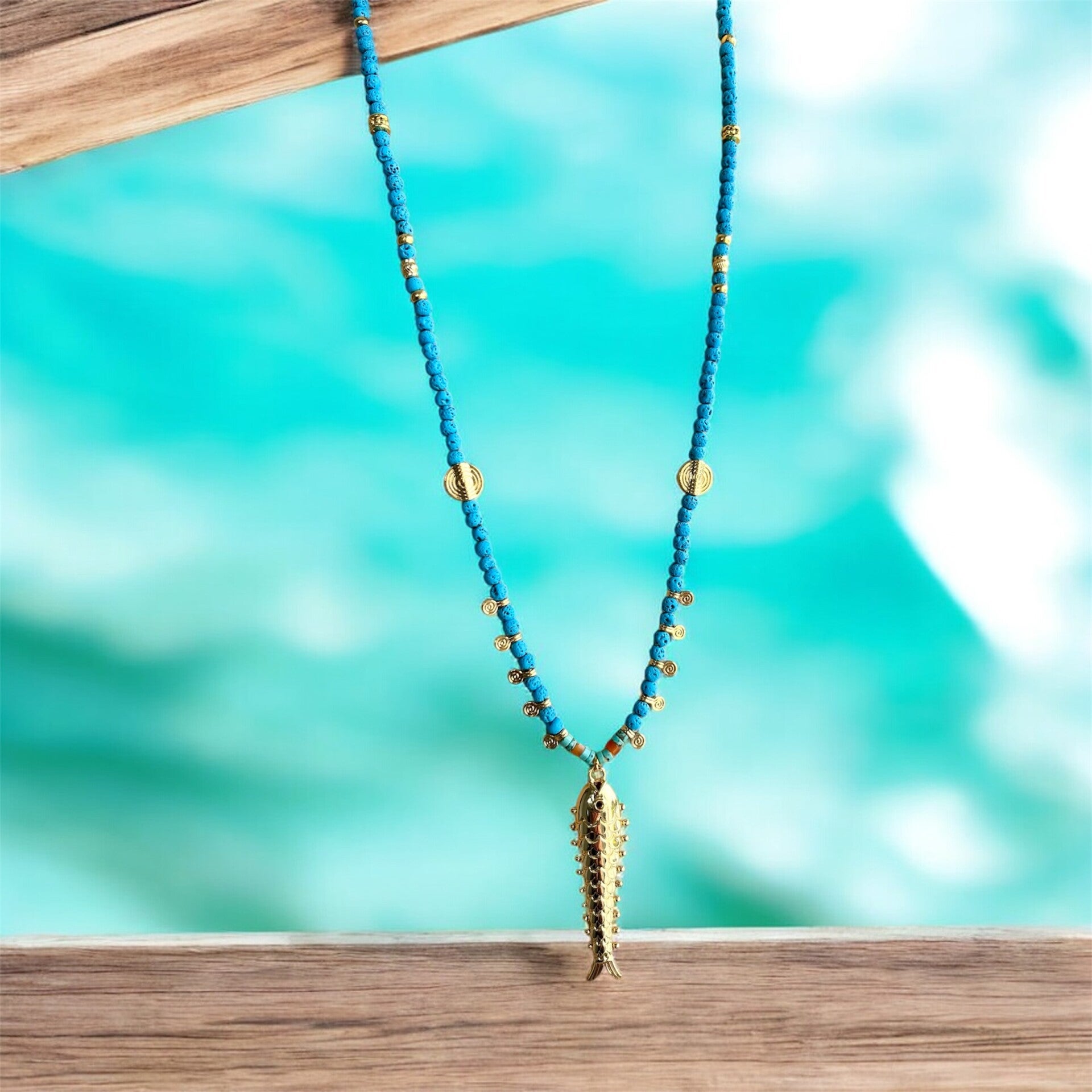 Ce sautoir raffiné se compose de perles en pierre de lave bleue, agrémenté d' intercalaires dorés texturés et de mini pastilles dorées qui apportent lumière et mouvement.