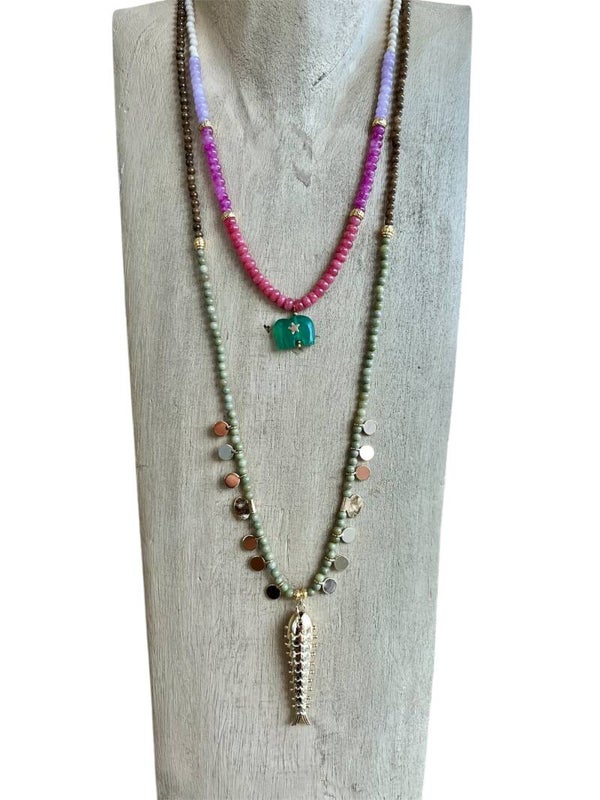 Sautoir Poisson doré et Pierre Onyx et Jade