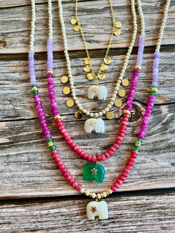 Un bijou raffiné et lumineux qui allie élégance et symbolique. Sa chaîne dorée 18 carats est ornée de délicates pampilles scintillantes qui captent la lumière à chaque mouvement. En son centre, un éléphant sculpté dans l' agate blanche, réhaussé d' une étoile dorée, apporte une touche porte-bonheur et spirituelle.