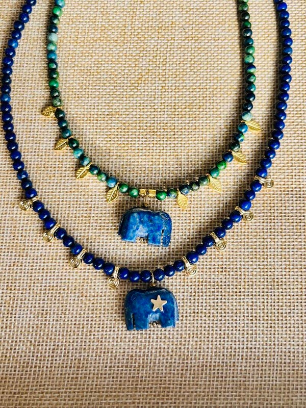 Un collier inspiré du style bohème chic. Réalisé à la main, ce collier se compose de perles en Lapis-lazuli bleu nuit, entrelacées de délicates pampilles dorées. Un pendentif éléphant en pierre naturelle décoré d' une étoile dorée - symbole de guidance et de chance.