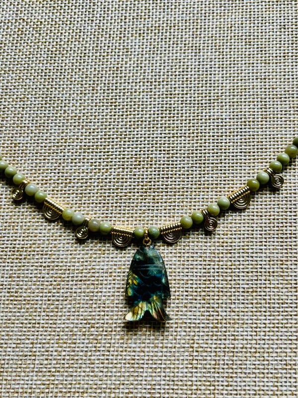 Il se compose de perles rondes en Agate alashan et de pampilles dorées spirales qui captent la lumière avec éclat. En son centre, un magnifique pendentif poisson sculpté en Labradorite, associé à la protection et le bien être intérieur.
