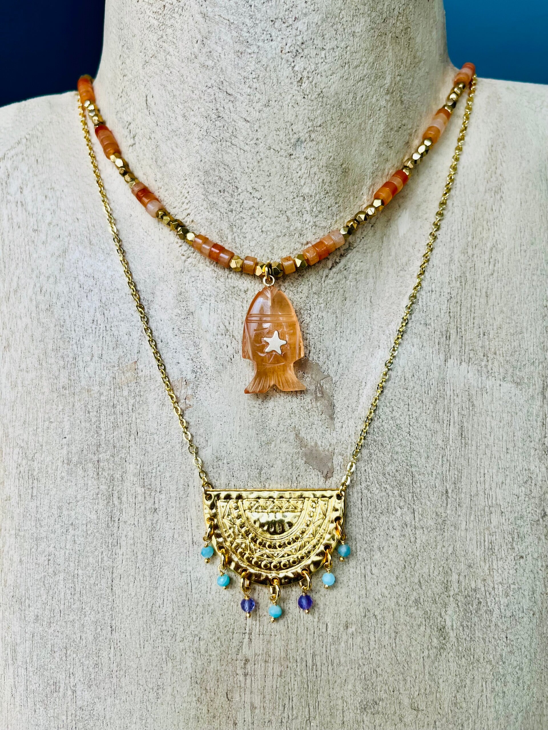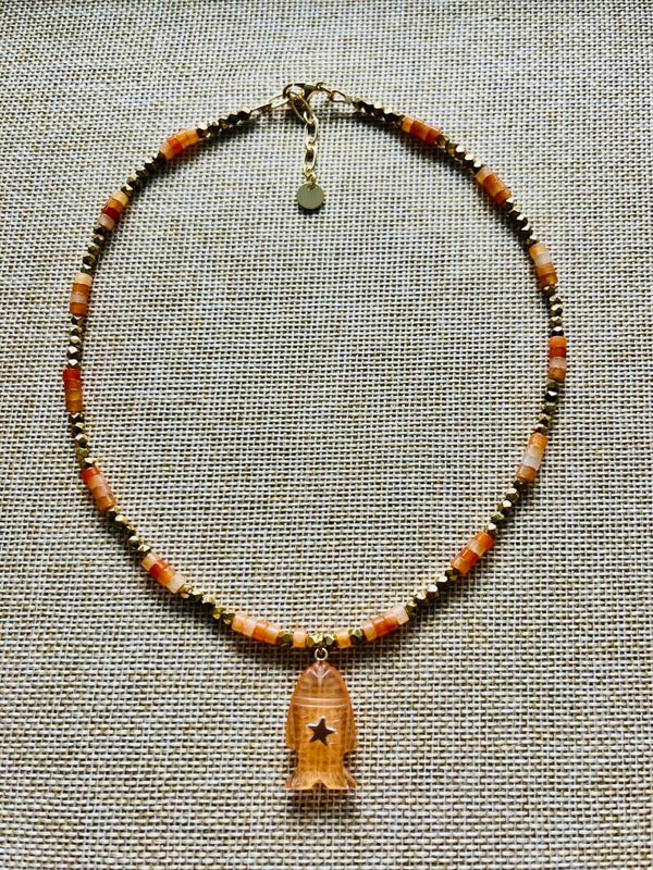 Ce collier poisson associe la douceur mystique de la pierre de lune à la vitalité solaire de la cornaline. Symbole de voyage intérieur et de transformation, il inspire intuition, créativité et équilibre émotionnel.